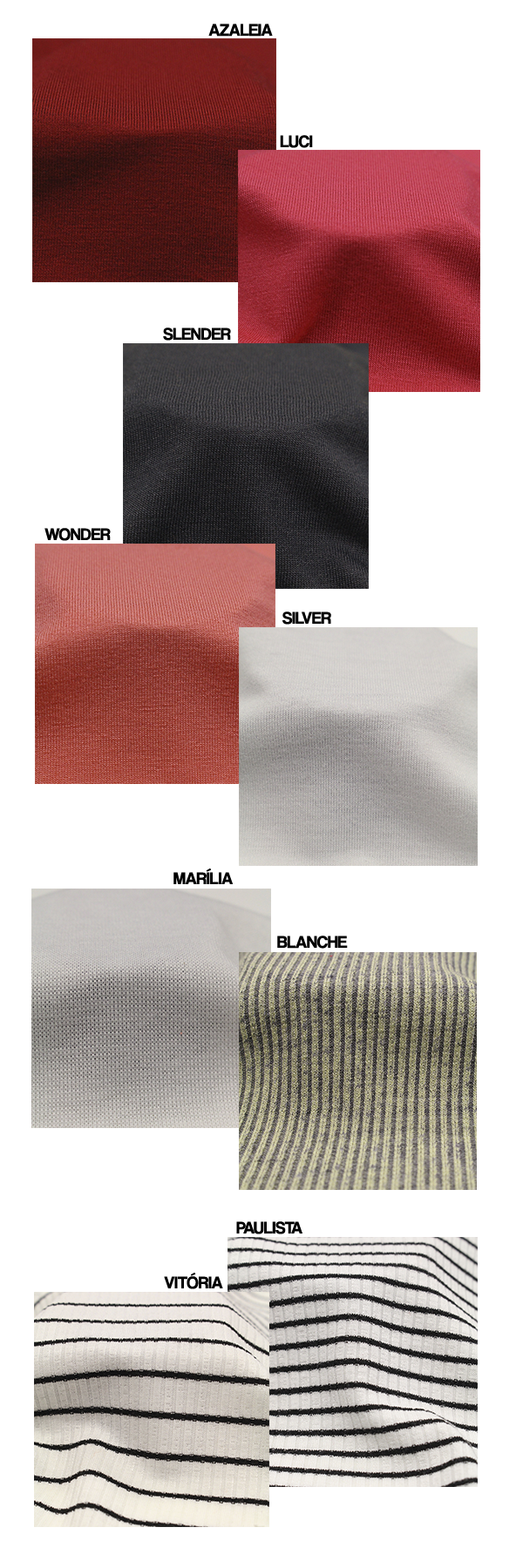 O artigo AZALEIA é uma viscolycra mais encorpada com caimento que pode ser utilizado também em t-shirts masculinas e assim como o LUCI, o SLENDER, o WONDER e o SILVER (que aceita sublimação) são ideais para peças fluidas, babados e drapeados. BLANCHE e MARÍLIA tem boa elasticidade e aspecto tricô, indicados para peças justas, enquanto os canelados PAULISTA e VITÓRIA são malhas com textura canelada listrada que podem fazer composê em peças femininas que desenham o corpo, pois possuem o mesmo mix de cores. Para mais informações técnicas sobre nossos artigos acesse nosso site: www.rvbmalhas.com.br.