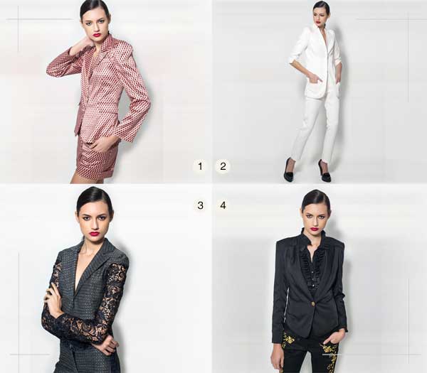 1# Blazer e short Empório Anna 2# Blazer e calça de jacquard UMA 3# Blazer brocado com manga de renda e calça E-Store 4# Blazer preto tipo smoking Carlos Campos, camisa de tricô com babado em cetim e calça bordada Renata Campos