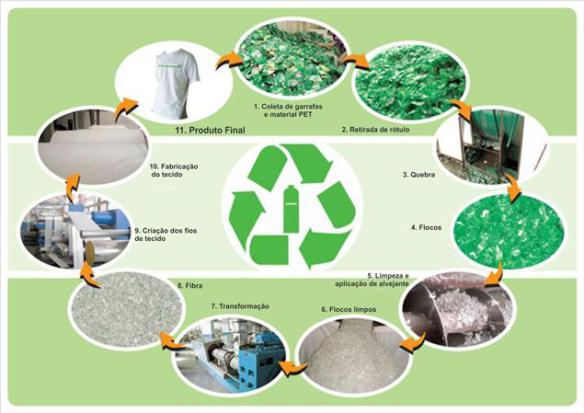 As garrafas são separadas, limpas e os rótulos são retirados > o plástico é quebrado em flocos e limpo novamente com aplicação de alvejantes > os flocos limpos são transformados em fibras > as fibras são processadas e viram fios de poliéster > os fios de PET são misturados com fios de algodão e se transformam em malha.