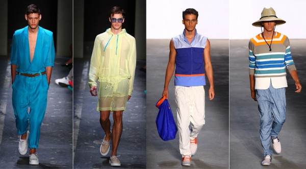 Os ternos vieram fluidos, paletós e coletes em seda, pantalonas molinhas constroem uma nova alfaiataria mais tranqüila longe de estruturas e ombreiras. A transparência permanece e é obrigatória até para os homens, o plissado, as assimetrias, as franjas, o tressé em cintos, sandálias e acessórios, a cestaria. Nos decotes temos as fendas profundas, vazados nas laterais e nas costas, muito tomara-que-caia e muita frente-única.
