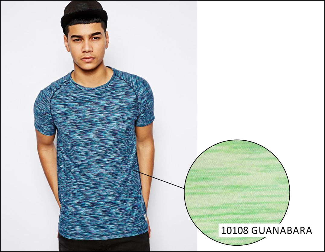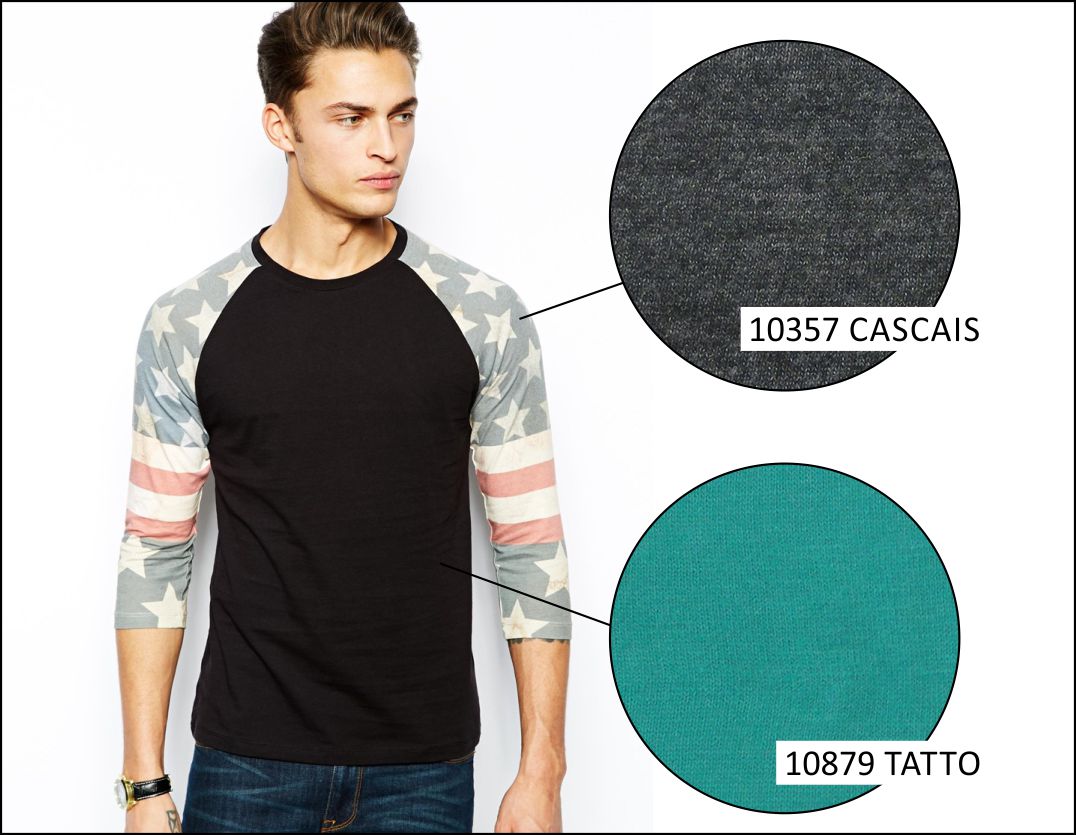 Manga raglan contrastante já um clássico esportivo na moda, aqui ela aparece um pouco mais comprida. Para deixar a peça mais leve, com a cara do verão, a sugestão é usar o Cascais e o Tatto, ambas malhas de fio 40/1. Na manga, você pode usar o Cascais que funciona muito bem para estamparia de sublimação.