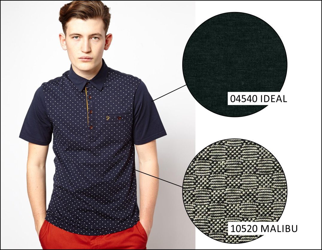 Pra finalizar, mais uma ideia misturando artigos. Aqui a polo fica com uma cara vintage graças ao Malibu, que tem esse ponto trabalhado que lembra um xadrez, tinto bicolor. Você pode misturar com o Ideal, que tem 50% de fibra reciclada. Olha o detalhe dos botões, que podem ser de metal ou madeira, e o cadarço interno na vista da gola.