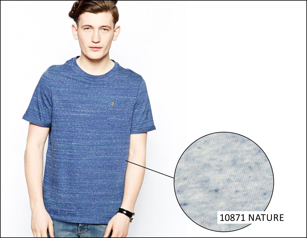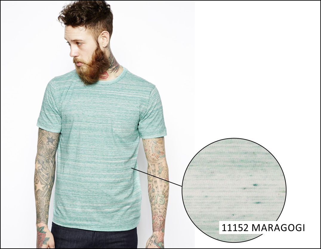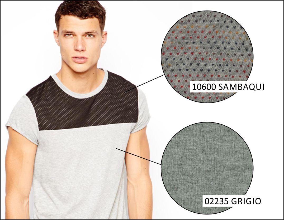 Nesse recorte você pode usar o Sambaqui, que é uma malha mescla com um pontinho diferenciado em fio multicolorido, dando um efeito bem discreto, junto o Grigio, que é nossa malha mescla básica. Pode ainda colocar uma estampa de uma cor em cima.
