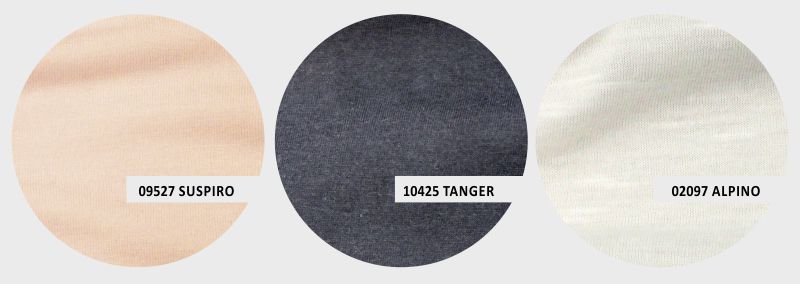 O Suspiro, meia malha fio 60/1, e o Alpino, malha fio flamê 30/1, são de poliester cardado, perfeitas para sublimação. O Tanger é uma meia malha de fio 60/1 de algodão penteado compactado, com acabamento resinado.