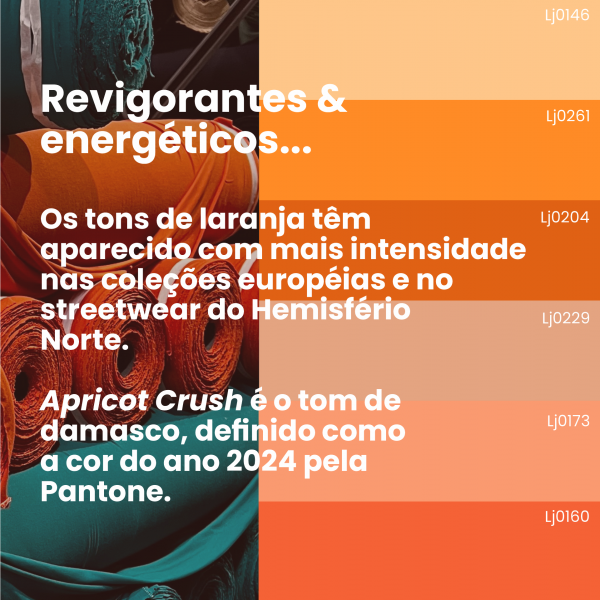 Seja pelo seu brilho no universo digital ou pelo seu uso como tom energético e restaurador, o LARANJA é uma cor que aponta para o futuro, para os sentimentos e as emoções. Laranja é calor, é cítrico, é irresistível aos olhos.