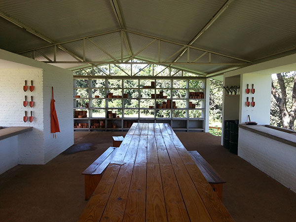 Em um pequeno galpão, que lembra uma estufa ou ateliê de jardinagem, inicia a obra de Marilá Dardot em Inhotim. “A Origem da Obra de Arte” é uma instalação que marca o interesse da artista pela linguagem escrita como matéria-prima.
