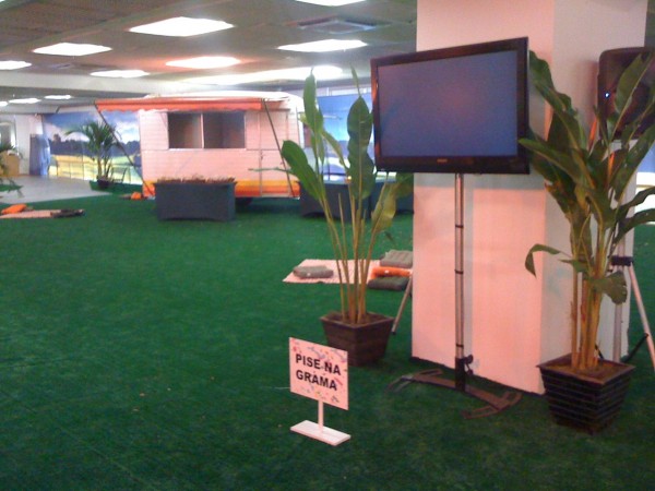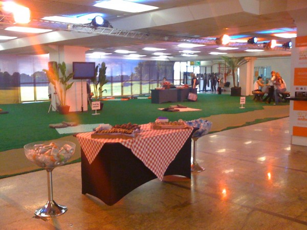 Trailler, toalhas de piquenique com almofadas, pomares e lago artificiais com delícias para os participantes relaxarem e curtirem um lanchinho entre os intervalos das palestras.