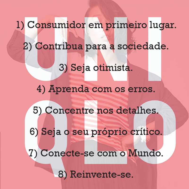 Em 1984 os 23 princípios de Yanai foram implantados na Uniqlo e permanecem atuais até hoje. Em entrevista ao portal Business of Fashion, ele resume sua cartilha em oito temas-chave, listados acima, que também servem como um roteiro do caminho de sucesso da gigante japonesa. Leia a matéria completa aqui.
