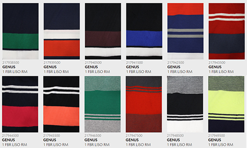 Padronagens listradas, uma das especialidades da RVB, são um clássico para todos os segmentos – do vanguarda ao streetwear. E para o Inverno 2018 preparamos mais uma família de listrados rapport (aqueles com repetição da sequência de listras): o GENUS é uma meia malha com fio de algodão penteado e compactado com elastano, ideal peças que prezam pelo conforto do elastano. Este artigo está disponível em doze variações e acompanha golas em algodão fio tinto.
