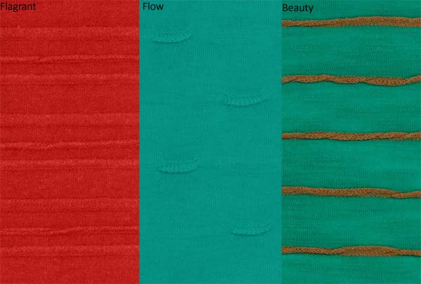 Nas malhas Flagrant e Flow, retenções engenhosas criam relevos irregulares. Já na Beauty, a mistura de relevo e cores distintas resulta em um trabalhado incrível.