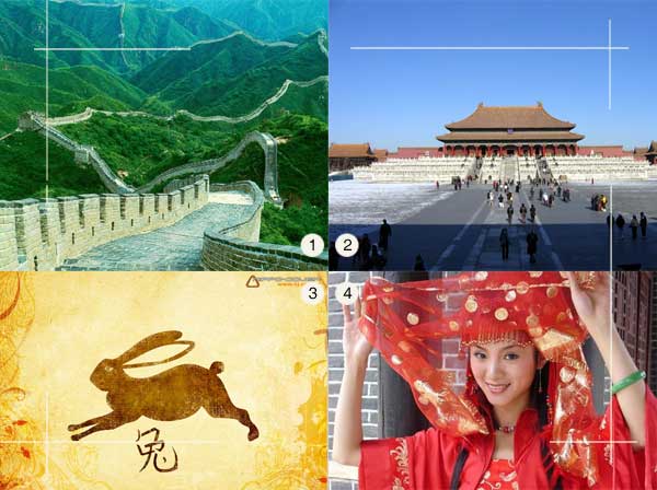 1# Muralha da China 2# Palácio chinês em Pequim 3# Coelho, um dos signos do zodíaco chinês 3# Traja típico do país